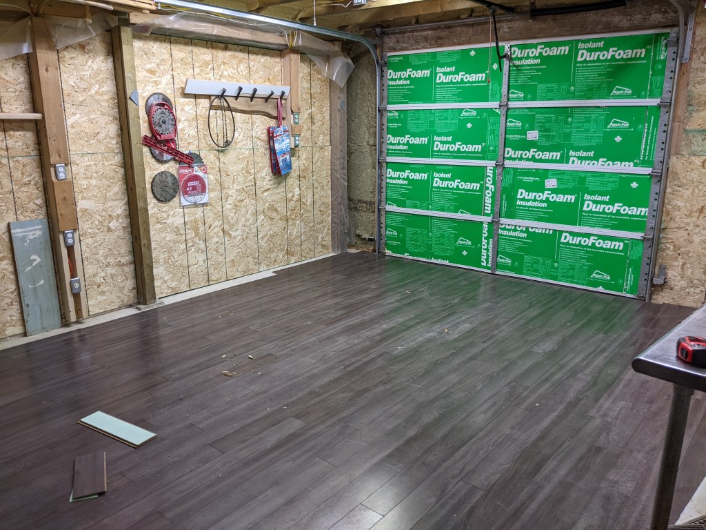 So where will be sleeping? In the shop! We’ve reorganized the shop to the main area is clear and we’ve put down the floor that we pulled up from the bedrooms in the house. This space will become our computer/office area, living room, and bedroom. We’re also planning on putting in the full-size fridge from the house along with some counter space and the full-size kitchen sink (assuming we can work out water and drainage with little issue) along with a small induction cooktop. So we’ll cook in here and eat outside, or in the trailer. Though we won’t be moving in until we’re ready to start tearing down the remaining part of the house.