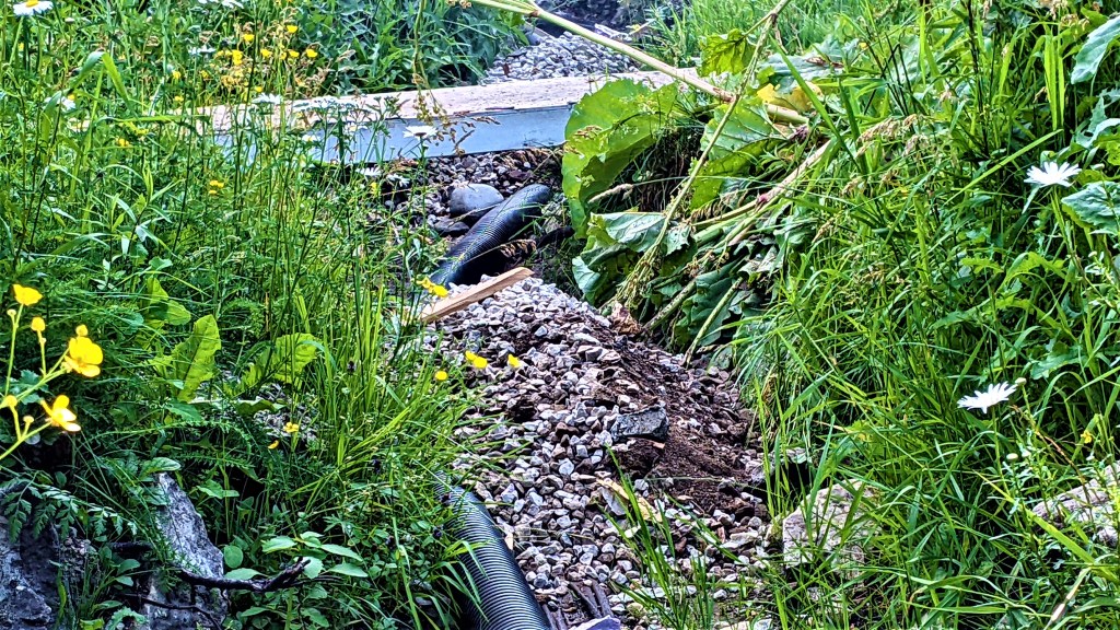 We picked up the stone we put down when we renovated the western addition and put it into one of the trench that has been running through the backyard with a pipe. Soon we should be able to fill it in and stop needing a bridge to get to the fire pit and the water.