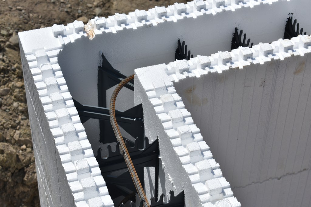 The blocks fit together like Lego, and all you have to do is make sure that you alternate the seams so one doesn’t go down the wall. There are metal bracing hooks for the corners and large zip ties for the cuts and seams to make sure the blocks don’t separate. Then you just have to put 10mm rebar horizontally in the blocks and 15mm rebar vertically before the concrete is poured inside. The styrofoam stays after the concrete is poured and acts as insulation.