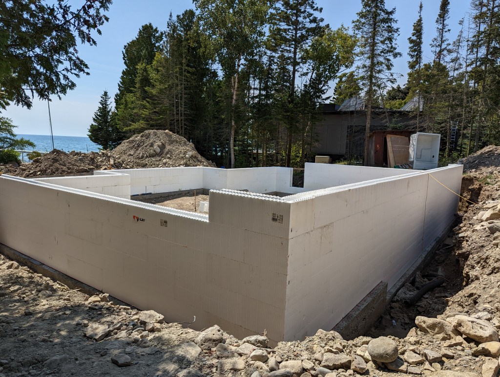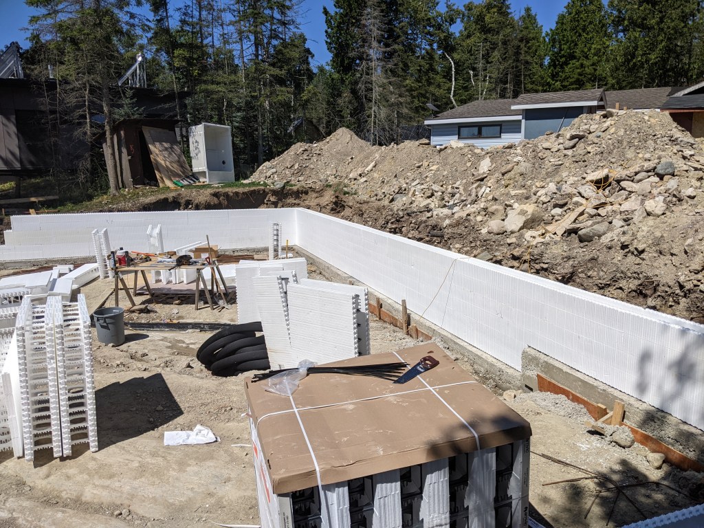 Much nicer and easier than the concrete was the installation of the ICF block. Ours came from Amvic Inc. and we purchased it through Peninsula I.C.F. Solutions Inc. I 100% recommend this product. The company who sold it to us was fantastic, coming by on Friday to teach us how to install it and we got over half done while they were here. It’s really easy to cut (when needed) and put together, light to lift, and simple to understand.