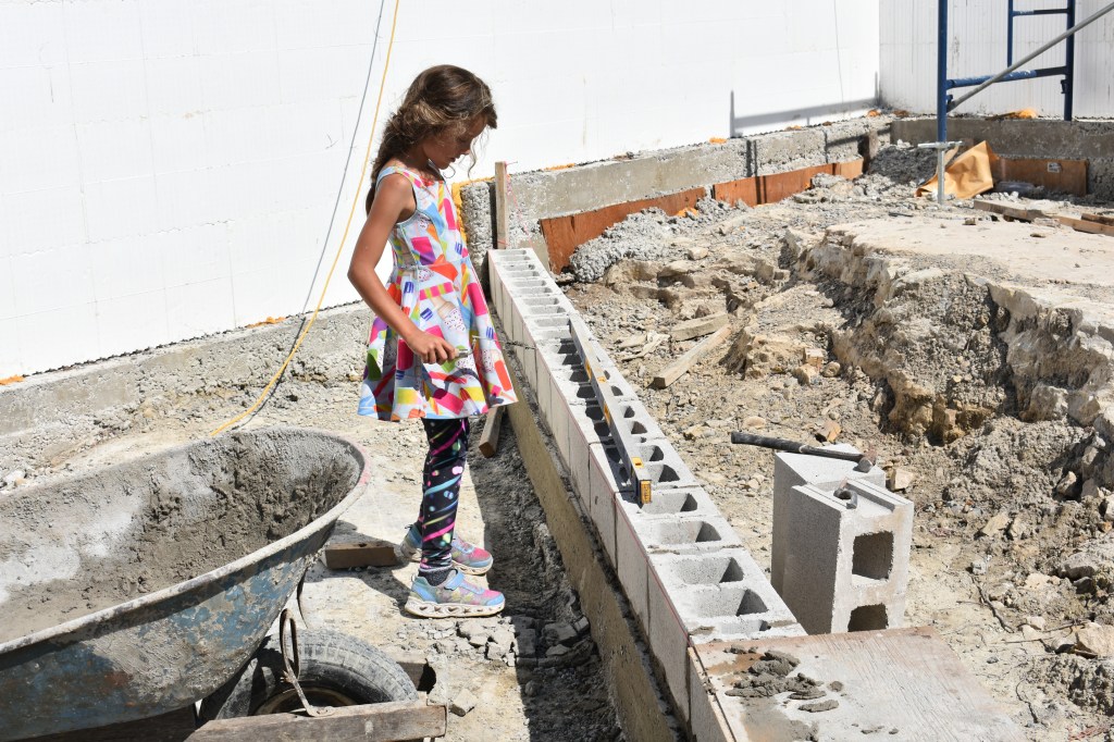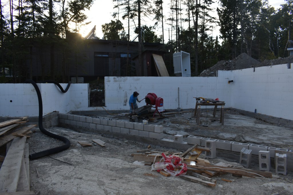 Since we don’t want an uneven floor in the basement we have to plan to have two levels with a couple of steps between them. Hence the building of this small cinderblock wall.