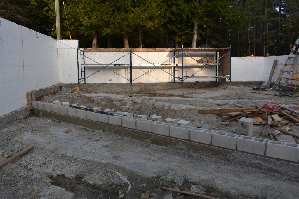 This wall runs on a diagonal between the South wall and the North wall, basically following where the bedrock drops down in an attempt to maximize the space that will be full height. The West side of the basement will have about eight feet of clearance to the first floor and the East side will have just over five feet. The plan is to put the water/utility room now in the basement and make the rest of it a play area for the child and dog.