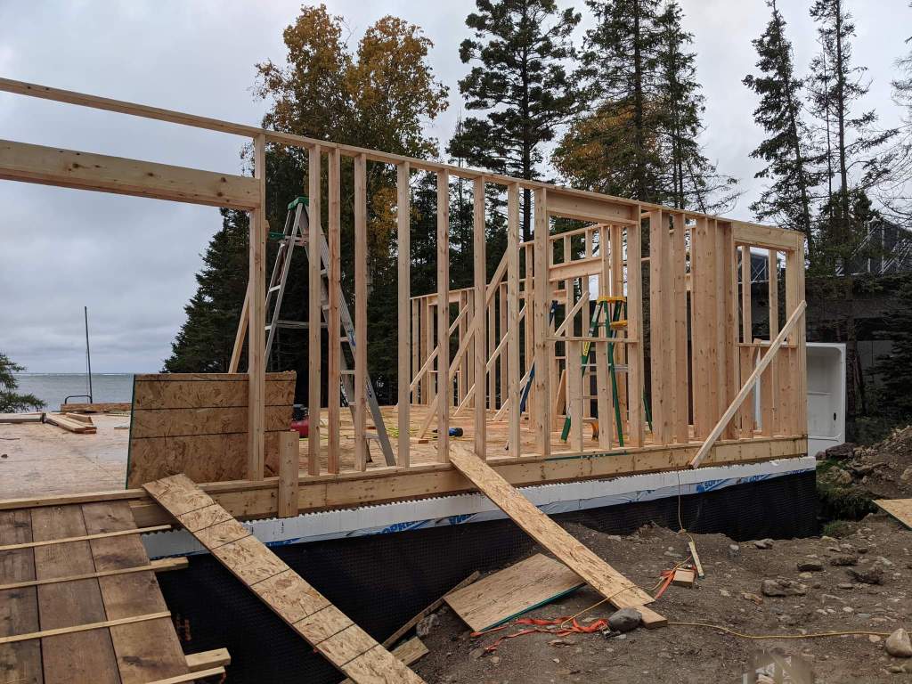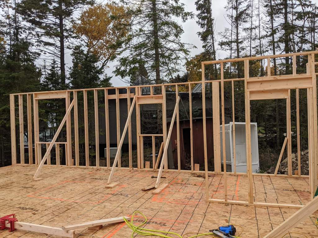 But getting this work done wasn’t a pleasant affair. We had a bunch of days of rain in which we worked to get the walls up. During these days of rain, we had some hail and even some snow. So we have already failed at getting the roof done before there’s snow, but maybe we can before there’s snow that stayed. Thankfully today it warmed up and didn’t rain, but we had a lot of wind to contend with. The next few days are supposed to be sunny and warm before it turns cold again, so we’re going to try to take advantage of that, especially with it getting dark earlier in the evening.
