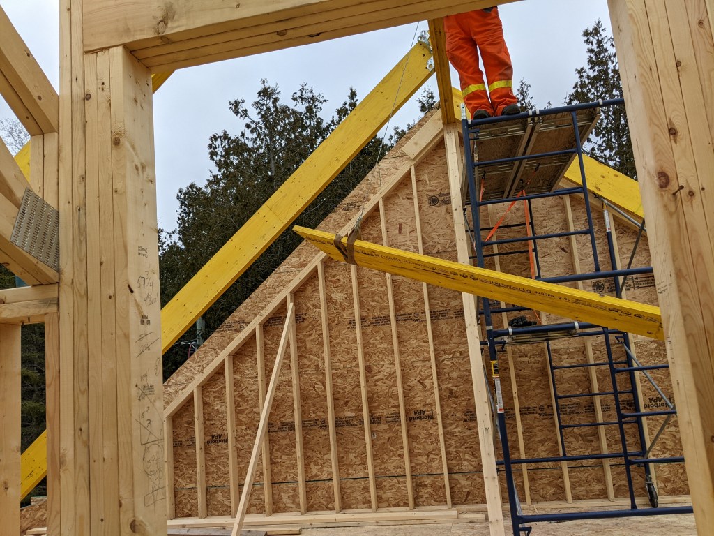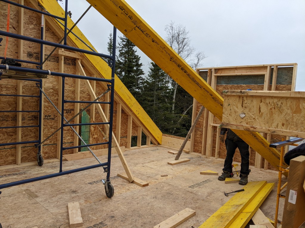 I’m glad we thought of this and were able to get a boat wench as I don’t know how we would’ve gotten it up 15 feet otherwise. Another thing that has become clear while installing these LVLs and sheeting on the roof is that you can not have too much scaffolding. Actually, the scaffolding has come in handy so many times throughout this project already, and we are planning on getting more.