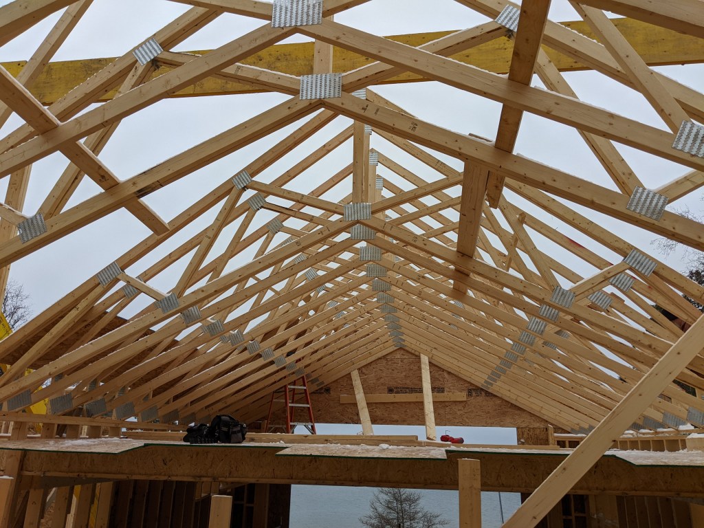 Since my last post, we built the temporary floor above the Great Room and installed all the trusses in the middle section of the house (Over the Great Room and the Office) and got a good chunk of that area sheeted. Unfortunately, this seems to be the end of our good weather (even if it was still cold sometimes) as we’re expecting freezing rain followed by snow tomorrow and more snow over the weekend.