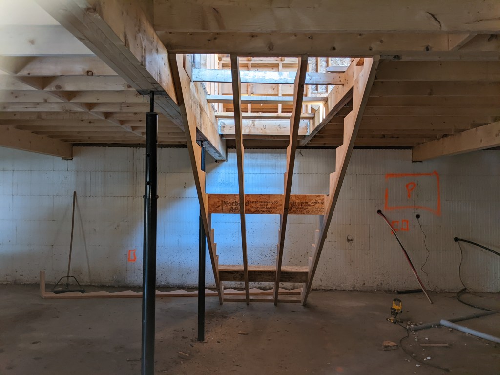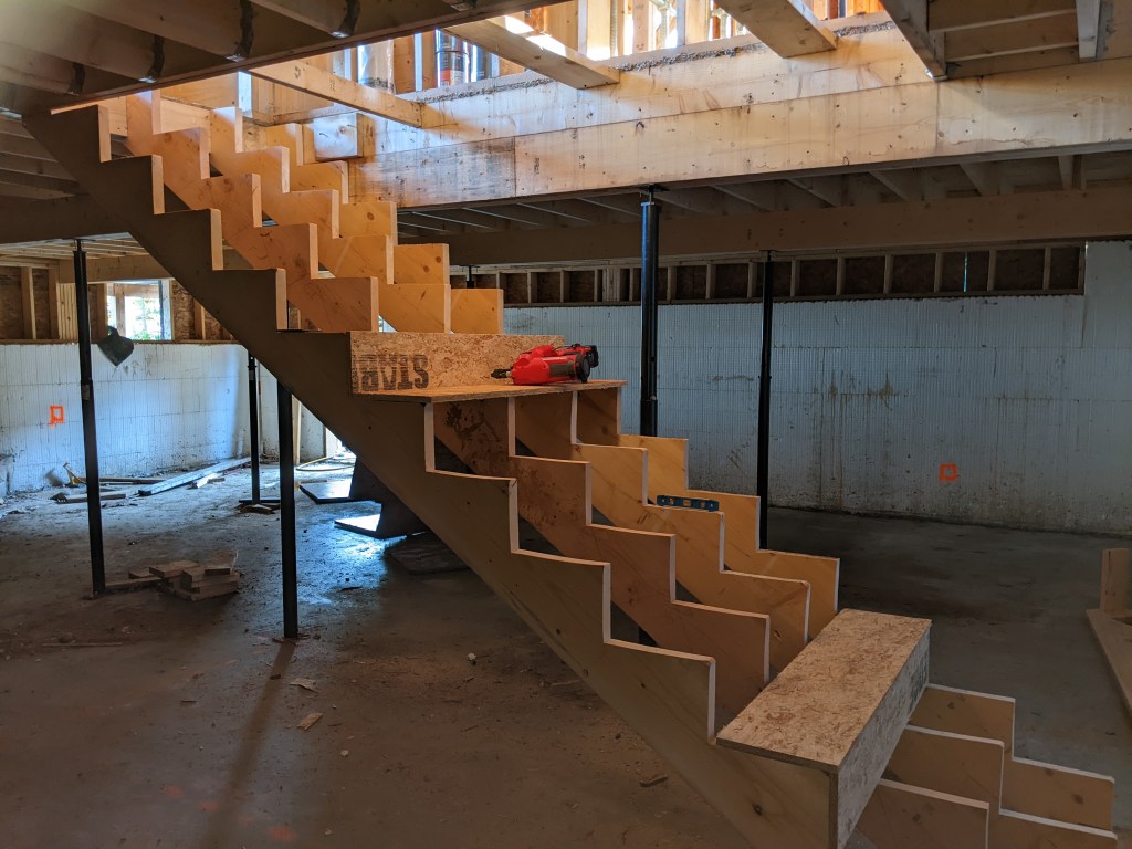 The nice thing about having the roof on is that we (and by “we” I mean “him”) can do some work inside the house on the days that rain. During times it’s been too wet to work on the deck stairs to the basement were made and today we (actually “we” this time) installed them. Well, as you can see we’ve only got the stringers done right now, but between cutting out the basement windows and opening this up to the main floor the basement is a lot less dark. Also when the stairs are finished it will be a lot easier to get into the basement as the outside door still has a just a dirt slope to get down.