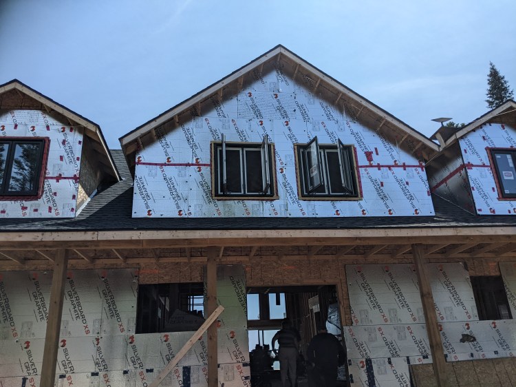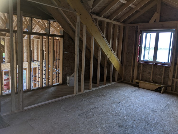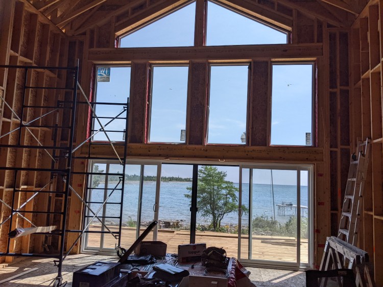 The first thing we got done was to get some windows installed. We hired some help to install the three sliding doors and the tall wall of windows, and they managed to install all the upstairs windows as well. That leaves only the first floor windows for us to finish. It makes a huge difference in the house now that we have the option to block the wind coming off the lake or letting it blow through the house. We also made the stairs to the basement able to be used.