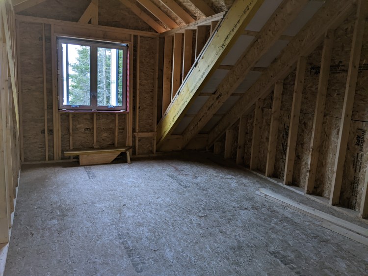 Even with shrinking the bathroom it will have a large walk-in shower, a seperate soaker tub (under the window), a linen closet, as well as the toilet and a sink with a vanity. It’s still a fairly large bathroom. We will have some “dead space” boxed in beside the toilet and at the back of the linen closet under the roof slope. After this we’re working on the east side of the upstairs which has two more bedrooms and now will also have another two-piece bathroom, but more on that next time. We’ve also started the front porch, but more on that next time as well.