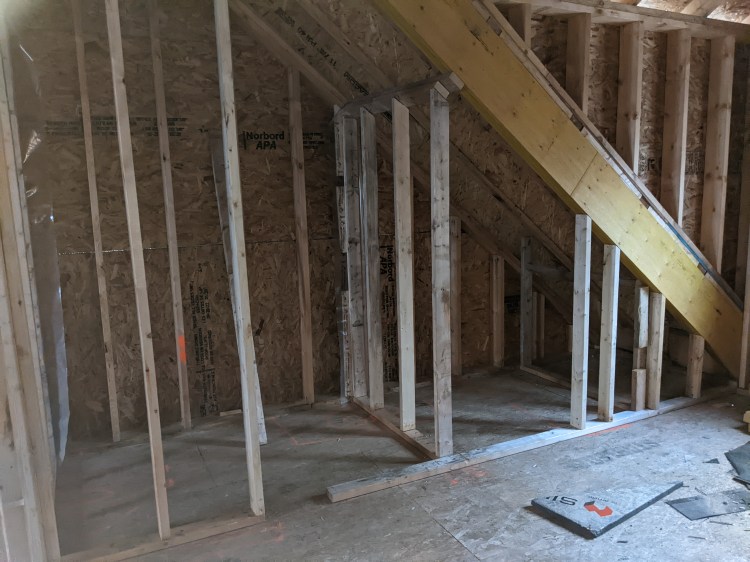 We’re putting in a large closed underneath the one roof slope, with a planned “den” for the dog at the end of it. (We have a few small spaces planned for the dog to hide in when she wants.) Our nine-year-old has already started to plan out how she want’s to organize her stuff in her room and has been giddy over how much room she is she going to have. Clearly getting excited as she wanted to check out paint, lights, and flooring the last time I had her at Home Depot.