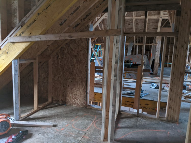 Once the doors were installed we started framing the rooms upstairs. We started with the west side, which contains our daughter’s room and the main bathroom. Originally these rooms were suposed to be the same size (you may remember the floor plans I shared earlier) but as we started to plan out the bathroom we realized that it was a BIG bathroom. So we decided to shrink the bathroom and increase the size of our dauther’s bedroom, which she was not upset about.