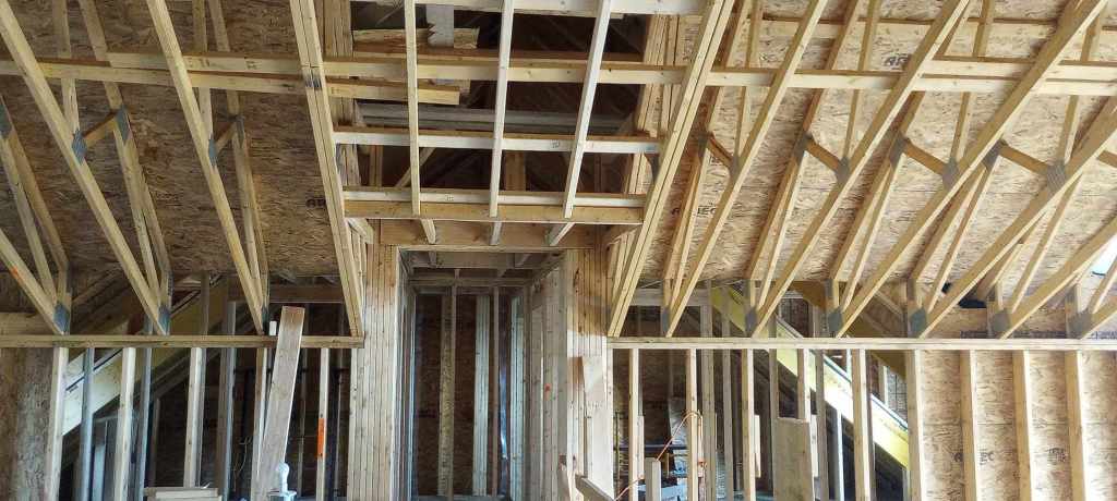 As you may remember from the plans the rooms upstairs are going to have a normal ceiling in all the rooms upstairs and then the vaulted ceiling in the office, carried through from the great room below. Since the last blog we’ve framed in the ceiling creating two attic spaces, which will have an access door in each of the small hallways.