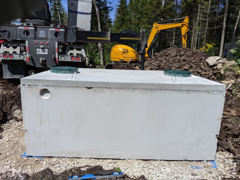 Also in the last three weeks our septic guy came to dig out and deliver our septic tank. We had planned to put it just to the side of the laundry room (northwest corner of the house) but the bedrock jumps back up again there, so we had to come up with another plan. (Some of you may recall that the reason we have a basement instead of a crawl space is becuse the bedrock dropped down by three feet right in the middle of our footprint.) So instead of putting it there we put it past the garage (which we still couldn’t get it as low as we wanted due to bedrock, but low enough that we can get it covered and landscape over & around it) and now we have a pump chamber where we originally wanted to put the septic tank.