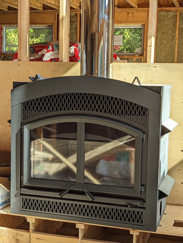We did get our fireplace in the month of October, but we need to be able to build the mantle and close in the chiminy before we can use it, and we need the furnace people (who are also the fireplace people) to come back before we can do that. We did get an order of wood, which is piled on the front porch, so that as soon as we can use it, we can enjoy a fire. It’s meant to be complementary to the propane heat that will run the furnace, but given how warm the house already is, we suspect this will heat the house on it’s own.