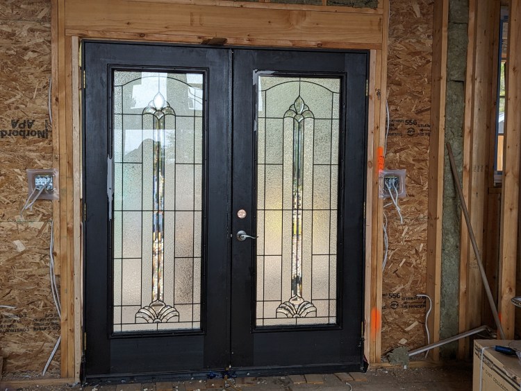 The front door has also been installed since the last blog post. Probably a given since I’ve been talking about how warm the house already is. It is a double door we won on auction, and the double door has already come in handy for moving things into the house. We’ve had the whole thing open often since its installation, though we suspect the left side will remain closed most of the time once we’re living in the house.