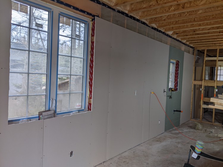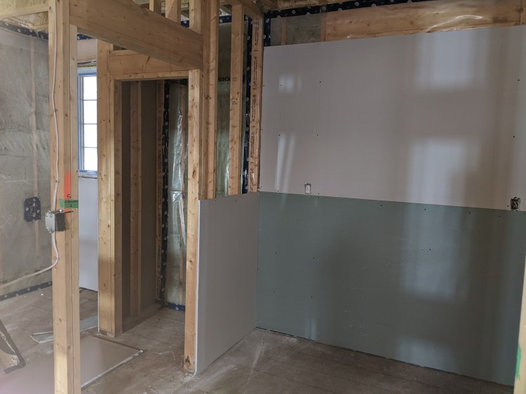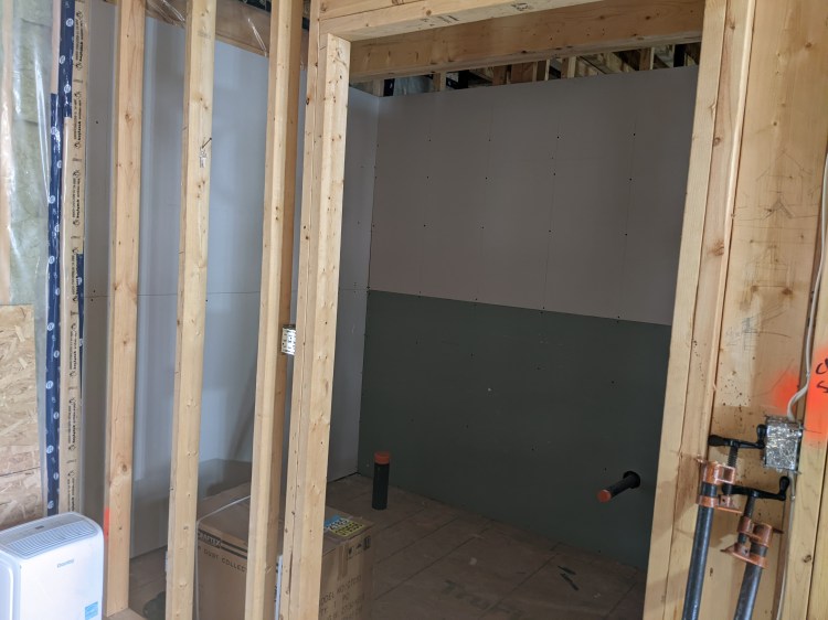 You may notice from the pictures the greenish drywall. That drywall is mold resistant, so we’re putting it where we expect water. (Behind sinks and toilets, by the washing machine, etc.) As mentioned above, we need to leave the walls exposed for the duct work when the furnace people arrive, but we can install it where duct work isn’t going to be.