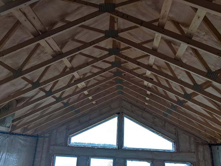 As mentioned in the last blog, the spray foam guys did come in the month of October. They were here for a week in order to put spray foam along the untire underside of the roof, the lake side (south) wall on all three floors (including basement), and a few other places where getting the Rockwool insulation would be difficult. As of the writing of this blog, we are still waiting on the invoice.