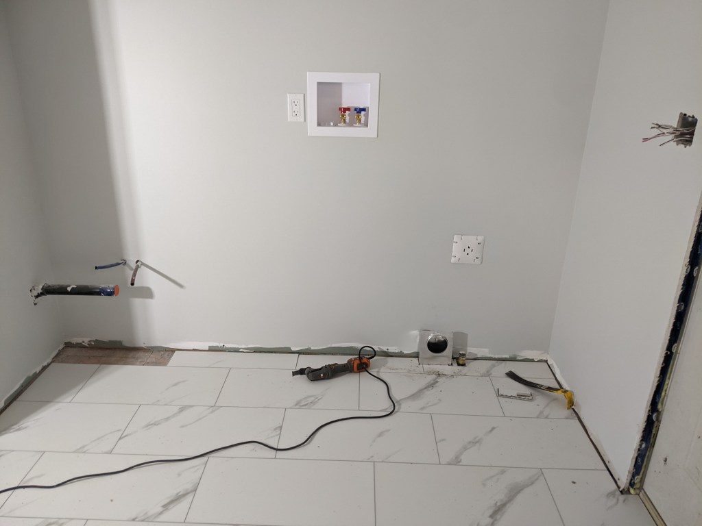 The laundry room has seen a remarkable transformation as well. Drywalled, painted, and floored, it’s almost ready to welcome back on-site laundry. The convenience of having laundry facilities at home is something we’ve missed, and its return is eagerly anticipated.