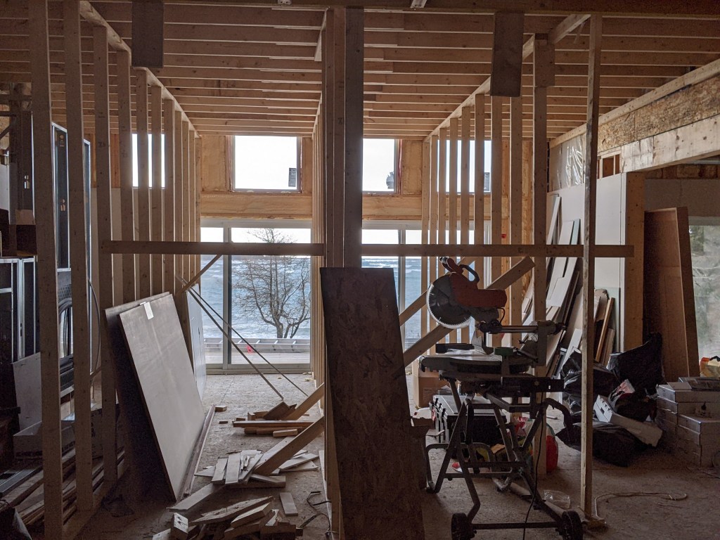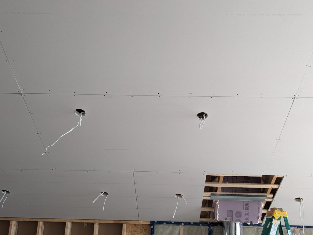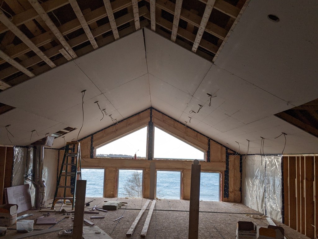 One of the major accomplishments during this period was the installation of a false floor in the great room, extending all the way up to the high ceiling. This was the most efficient way of drywalling up there and installing the potlights.