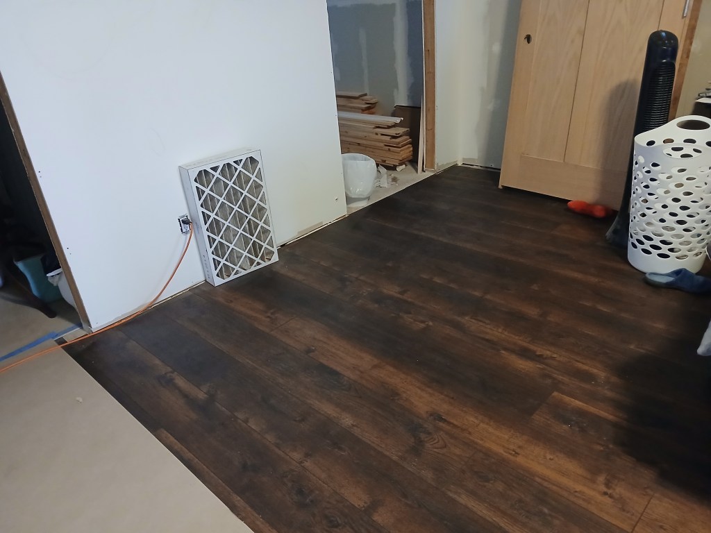 The house is starting to take shape as we floored a few rooms in the last five months. In the master bedroom we have a dark floor called Amber Ale, which we chose and purchased ages ago in order to make the room look a little smaller. (It is seriously a massive bedroom.)