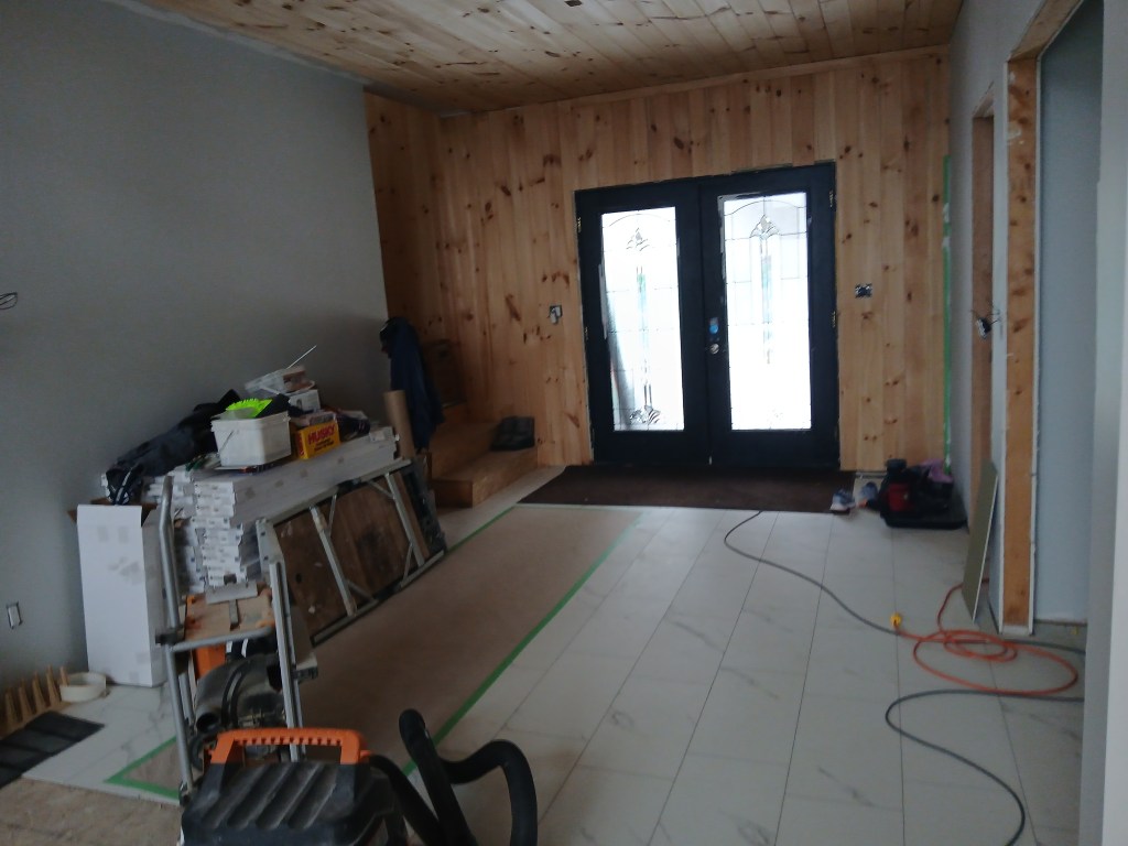 We floored the front hall, half bath, and closet with the same floor that is in the laundry room, called Moon Glow. This means we are actually finished installing that particular floor! We added a mat we already had to protect it from wet, snowy boots, as well as we have some paper put down in high traffic areas to protect the floor until the house is finished.